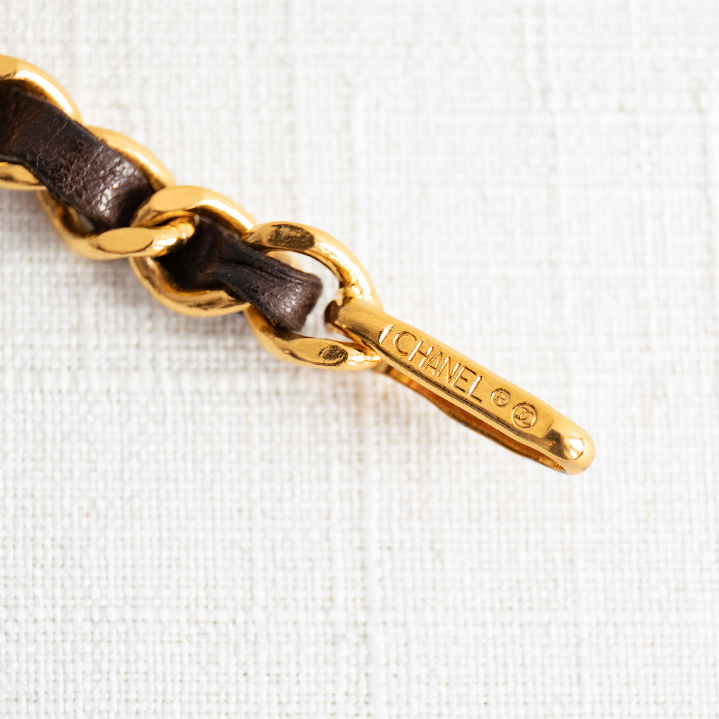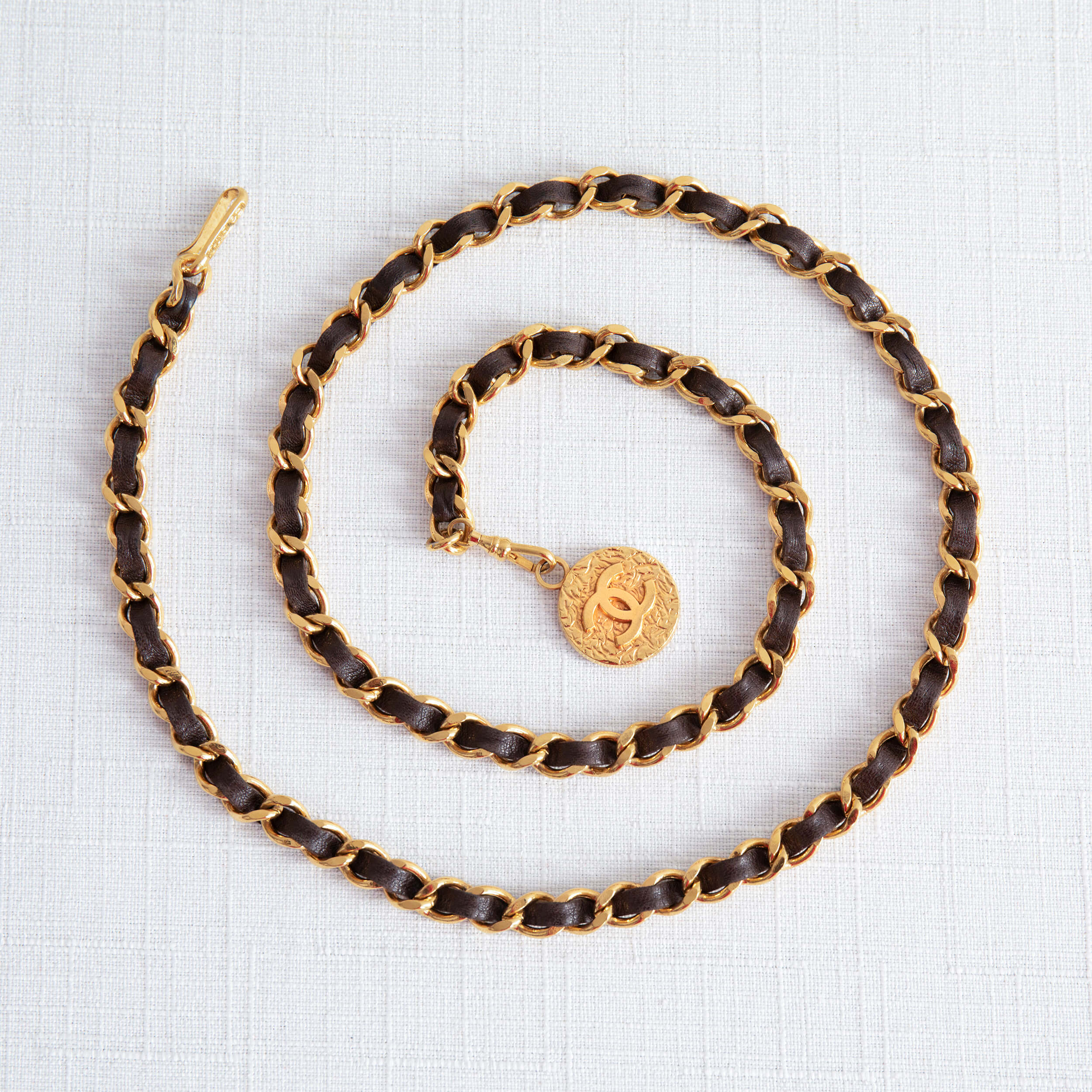 Diese originale CHANEL Vintage Gürtelkette / Halskette ist aus der klassischen mit Leder gewebten Metallkette gefertigt und verfügt über eine CC-Signatur am Abschluss. Die Schließe kann flexibel an jeder Stelle der Kette eingehakt werden, so dass der Gürtel variabel an Hüfte oder Taille sowie auch als Halskette getragen werden kann.
